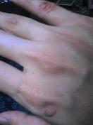 右手:甲(人差し指の拳の辺り)。小指の第二関節と指先。